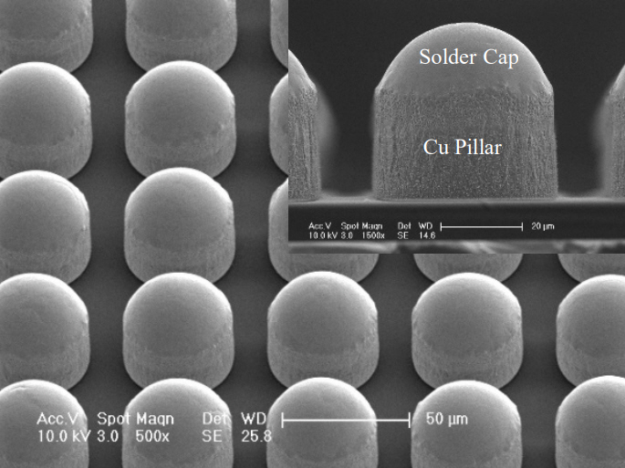 그림 1에 나타낸 바와 같이 마이크로 솔더 범프의 경우 좁은 피치로 인하여 플립칩 공정 시에 인접한 솔더 범프 간의 솔더 젖음에 의한 Short 현상을 방지하기 위하여 SEM 사진에 나타낸 바와 같이 반도체 소자의 표면에 Cu Pillar를 형성한 후 Cu Pillar 위에 Solder Cap을 형성하는 방법으로 솔더 범프를 형성한다.