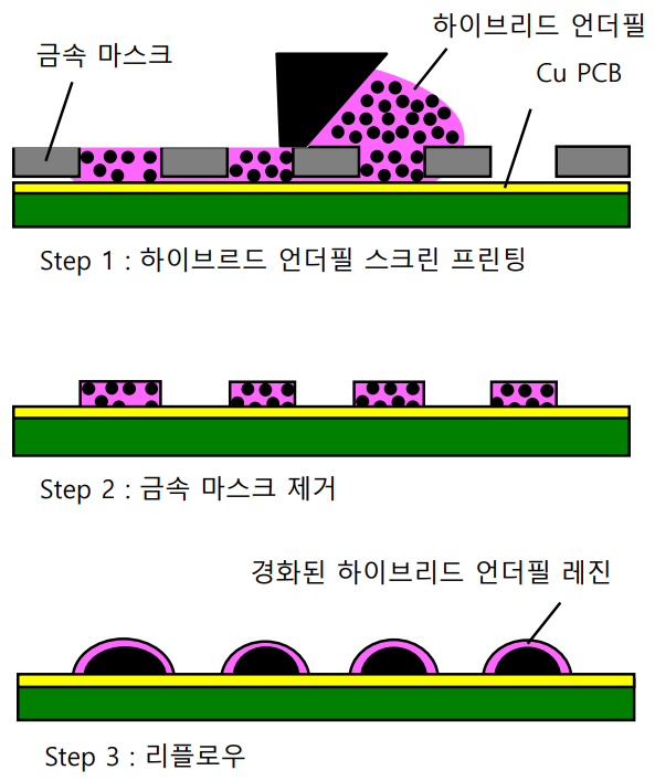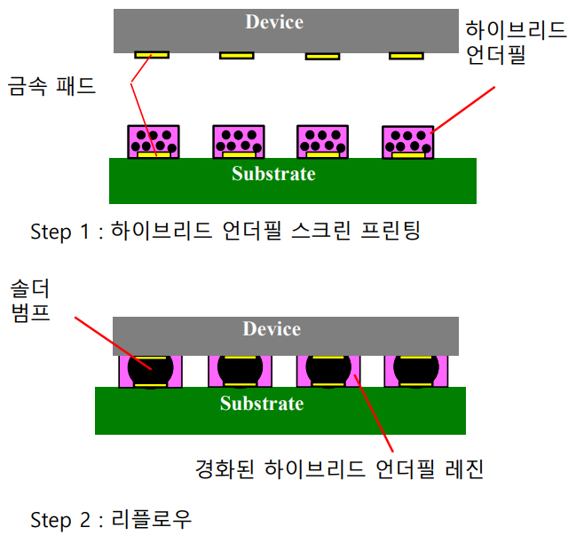 하이브리드 언더필 소재는 솔더 분말과 산화막 제거 기능을 갖는 에폭시 기반의 하이브리드 언더필 레진과의 혼합으로 구성된다. 그림 9는 하이브 리드 언더필 소재의 적용 공정도를 도식적으로 나타낸 것으로서 하이브리드 언더필 소재는 솔더 범프가 형성되어 있지 않은 상태의 반도체 소자와 기판 간의 금속 패드 전극을 연결하기 위한 소재이다. 하이브리드 언더필 소재를 기판의 금속 패드 위에 스크린 프린팅 공정으로 도포한 후 솔더 범프가 형성되어 있지 않은 반도체 소자를 정렬한다. 이후 리플로우 공정을 진행하면 솔더 분말은 녹음 현상과 함께 하이브리드 언더필 소재의 레진에 의하여 솔더 분말의 산화막이 제거되고, 솔더 분말 간의 젖음 특성에 의하여 솔더 범프를 형성함과 동시에 상하부의 금속패드를 전기적으로 연결하게된다. 이때 솔더 분말 사이에 위치한 레진은 솔더 분말 간의 결합력에 의하여 솔더 범프 외부로 밀려나서 솔더 범프 주위를 감싸는 형상을 가지게 되고 하이브리드 언더필 레진은 화학반응에 의하여 고상으로 변화하게 된다.