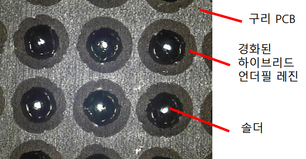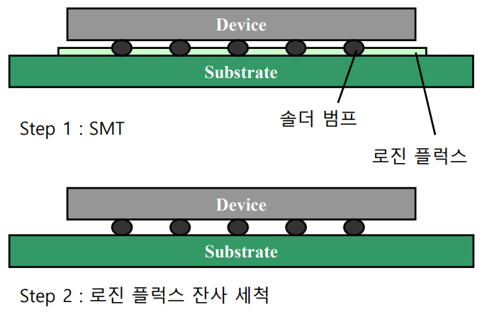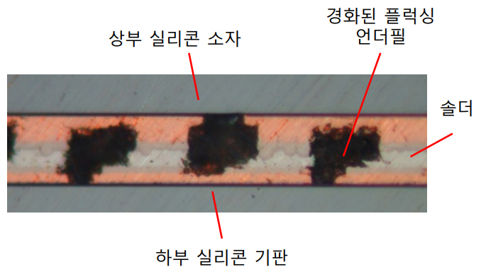 이러한 경우는 그림 2의 플립칩 공정 이후 로진 기반의 플럭스의 잔사 세척 공정도 불가능한 지경에 이르게 된다.