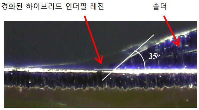 그림 11은 하이브리드 언더필의 리플로우 공정 후 표면을 관찰한 사진으로 온도가 증가하여 솔더의 녹는 온도인 약 138℃에 도달한 순간 솔더의 산화막이 제거됨과 동시에 솔더는 프린팅된 중앙 부분에 젖음 특성을 나타내고 하이브리드 언더필 내에 포함된 레진은 솔더의 가장자리 부분으로 밀려나서 타원형 모양을 형성하였다. 그림 12는 이와 같이 리플로우 공정에 의하여 형성된 솔더 범프 가장자리 부분의 단면 사진으로 솔더는 PCB상의 구리 표면에 약 35°의 젖음각을 나타내므로 구리기판의 산화막은 하이브리드 언더필 소재에 포함된 환원제에 의하여 적정하게 제거되었음을 확인할 수 있다.