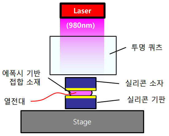 레이저를 이용한 접합 공정(LAB: Laser Assisted Bonding)은 그림 13에 나타낸 바와 같이 반도체 산업계에서는 파장 980nm의 면레이저 방식을 적용하고 있다. 레이저 소스부터 발진된 레이저는 광학계를 통하여 조사하고자 하는 면적에 균일하게 출력된다. 시료에 압력이 필요한 경우에는 레이저와 시료 사이에 레이저의 흡수가 거의 없는 투명한 쿼츠를 넣고 쿼츠를 사용하여 시료에 압력을 가하는 상태에서 레이저를 조사한다. 쿼츠를 통과한 레이저는 시료 상부 반도체 소자 표면에 도달하여 반도체 소자의 레이저 흡수율에 따라 소자의 온도가 증가하게 된다. 수초 동안 레이저에 의하여 가열된 열이 열전도 방식으로 순간적으로 반도체 소자 아랫면에 위치한 솔더 범프 혹은 접합 소재에 전달하여 접합 공정을 완료하게 된다. 반도체 소자와 기판 사이의 온도는 열전대를 사용하여 측정하고, 실제 공정 중에는 IR 카메라 이미지를 통하여 온도를 측정하므로 레이저 공정 중에 실시간 온도 변화의 관찰이 가능하다.