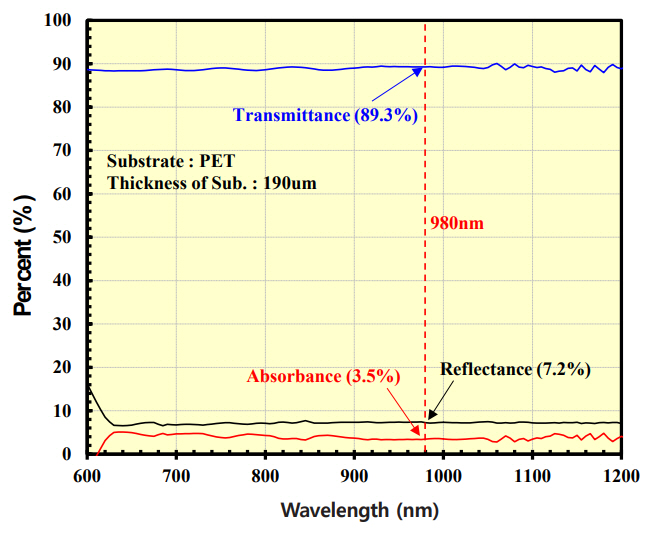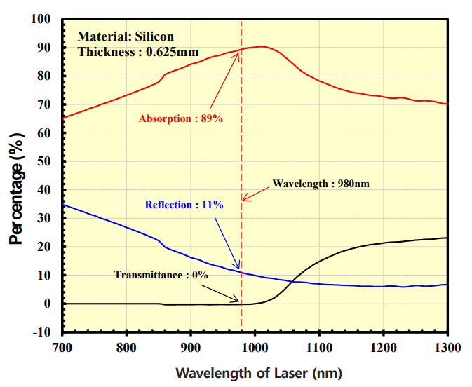 일반적으로 반도체 소자 재료로 많이 사용되는 실리콘에 대하여 레이저 흡수, 반사 그리고 투과율을 측정한 결과 실리콘 두께 0.6mm의 경우 그림 14에 나타낸 바와 같이 레이저 접합 공정에 사용되는 980nm 파장대역에서 각각 89%, 11%, 0%가 관찰되었다. 실리콘 재료는 980nm 파장에서 89%의 레이저 에너지를 흡수하므로 그림 13에 나타낸 바와 같이 레이저가 실리콘 소자 표면에 도달하는 순간 급격한 온도 상승 및 열전도로 인하여 반도체 소자의 순간적인 접합 공정이 가능함을 알 수 있다. 최근에 유연 디스플레이 혹은 가격 경쟁력을 위하여 상대적으로 180℃ 이상의 공정 온도에서 열변형에 매우 취약한 PET 등의 재료가 기판 소재로 사용되고 있는 추세이다. 그림 15는 두께 0.19mm 투명 PET 기판의 레이저 흡수, 반사, 그리고 투과율을 측정한 결과이다. PET 기판의 반도체 접합 공정에 사용되는 980nm 파장대역의 레이저 흡수, 투과, 반사율은 각각 3.5%, 89.3%, 7.2%로 측정되었다. PET 기판에 실리콘 소자를 레이저를 사용하여 접합하는 경우, 반도체 실리콘 소자와 기판에 동시에 레이저가 도달하면 실리콘은 89%의 흡수율로 급격하게 증가하는 반면, PET 기판의 레이저 흡수율은 3.5%이므로 매우 미미하게 온도가 상승하므로 레이저 공정 중 PET 기판의 열변형의 가능성은 매우 낮다. 따라서 약 220℃의 녹는 온도를 갖는 SAC305 조성의 솔더 범프의 경우에서 PET 기판에 접합 공정이 가능함을 알 수 있다.