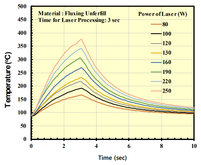 레이저 접합 공정 중 열전대를 실리콘 소자와 기판 사이에 삽입하여 온도 변화를 측정한 결과 그림 17에 나타낸 바와 같이 레이저 출력 80~250W 영역에서 3초 동안 온도는 급격하게 상승함을 관찰할 수 있었다. 그림 16의 실리콘 소자와 기판 간의 레이저 접합 공정을 위하여 실리콘 소자와 기판 사이에 플럭싱 언더필 소재를 도포하고 소자와 기판을 정렬한 후, 솔더 범프의 조성인 Sn/Ag의 녹는 온도보다 높은 온도를 얻기 위하여 레이저 출력 160W를 3초간 실리콘 소자에 조사하였다. 플럭싱 언더필 소재의 완전한 경화를 위하여 솔더 범프의 녹는 온도보다 낮은 180℃에서 1시간 후경화 공정을 진행하였다.