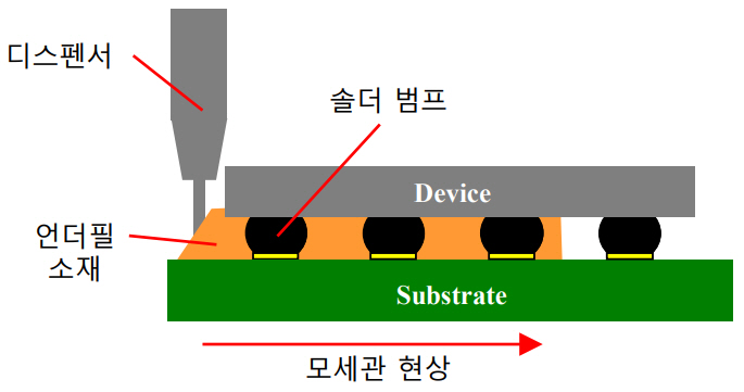 이와 같은 언더필 공정은 반도체 소자와 기판 간의 간격이 좁아질수록 모세관 현상에 의한 충진 시간은 급격하게 길어지게 되고, 반도체 소자와 기판 간의 간격이 10μm 이하가 되는 경우에 모세관 현상에 의한 언더필 충진이 불가능하게 된다.