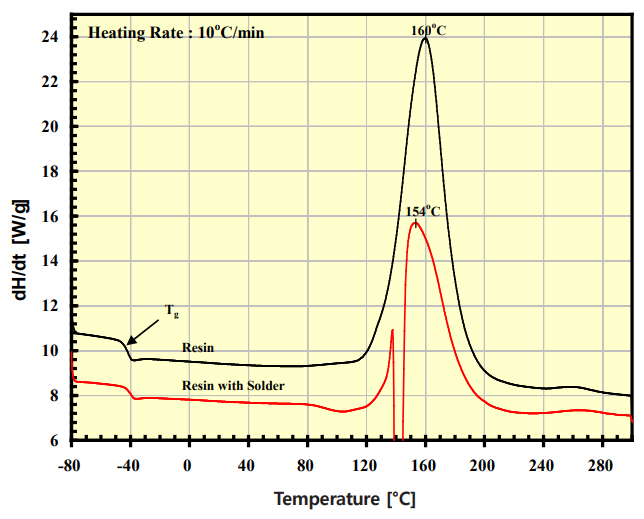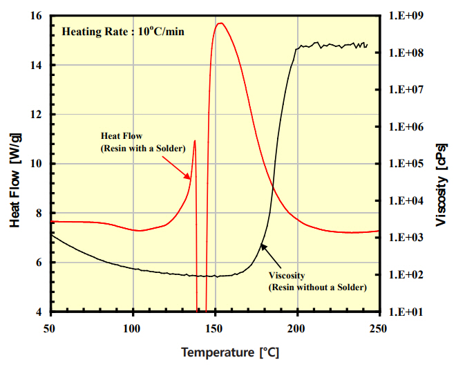 그림 5는 플럭싱 언더필 소재의 10℃/min 승온 속도 조건에서 DSC 열분석결과이다. 흑색으로 표기된 그래프는 플럭싱 언더필 레진 자체의 화학적 반응 결과이고, 적색으로 표기된 그래프는 솔더 범프를 포함한 플럭싱 언더필 소재의 열분석 결과이다. 온도가 증가함에 따라 두 개 그래프의 약 –40℃에서 플럭싱 언더필 소재의 화학반응 전의 유리전이온도가 관찰되고, 약 110℃ 부근에서 소재의 화학적 반응이 시작되는 것이 관찰되며, 적색의 그래프는 솔더 범프의 녹음에 의한 흡열반응을 약 138℃에서 나타내고 있다. 이후에 플럭싱 언더필은 격렬한 화학적 가교 반응을 나타낸 후 약 240℃에서 반응이 종료되고 있다. 특히 화학적 반응 피크가 흑색의 경우 160℃에서, 적색의 경우 154℃에서 각각 관찰되는 것은 솔더 범프가 다소 촉매로서의 역할로 인하여 솔더를 포함한 플럭싱 언더필 소재의 반응 피크 온도는 순수 플럭싱 언더필 소재에 비하여 약 6℃ 감소한 것으로 사료된다.