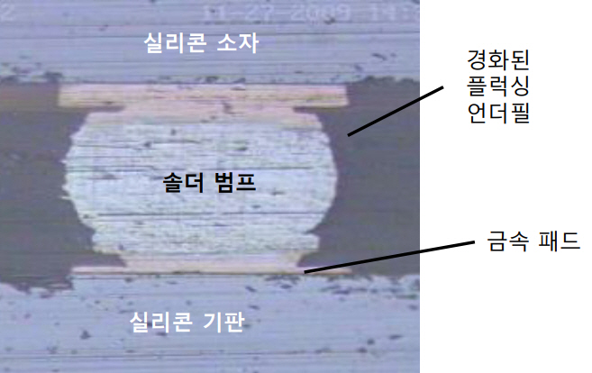 그림 7에 나타낸 바와 같이 플럭싱 언더필 소재를 적용하여 솔더 범프를 접합하기 위하여 실리콘 기판에 직영 60μm의 솔더 범프를 형성하고 실리콘 기판에선 구리 패드를 형성하였다. 플립칩 공정에 따라 접합 공정을 진행한 후 그림 8에 접합된 솔더 범프의 단면을 관찰하였다. 솔더 범프는 플럭싱 언더필 소재에 의하여 산화막이 제거되어 실리콘 기판의 구리 패드에 완전한 젖음 특성을 나타내었다. 솔더 범프 주위의 플럭싱 언더필은 경화 반응이 완료되면서 고상으로 변화되어 언더필 역할을 하고 있음을 확인하였다.
