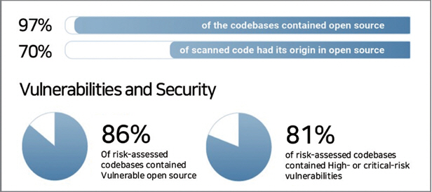 오픈소스 소프트웨어를 활용하는 것은 비용 절감, 개발 속도 향상, 혁신 촉진 등의 장점이 있지만, SW 생태계에서 오픈소스 활용 비중이 높아지면서 오픈소스로 인한 보안 위험을 공격 벡터로 악용되는 사례가 증가하고 있다. 기업이 사용하는 SW 중 약 97%가 오픈소스를 포함하고 있는 것으로 보고되고 있다. 그중 코드 베이스의 약 86%는 한 개 이상의 취약점을 포함하고 있어 개발 과정에서 오픈소스의 활용 비중이 높으나 보안관리는 미흡하다는 것을 알 수 있다. 이 중에서 고위험군의 취약점은 약 81%로 오픈소스 재사용으로 인한 사이버 위협 심각성이 대두되고 있다(그림 1).