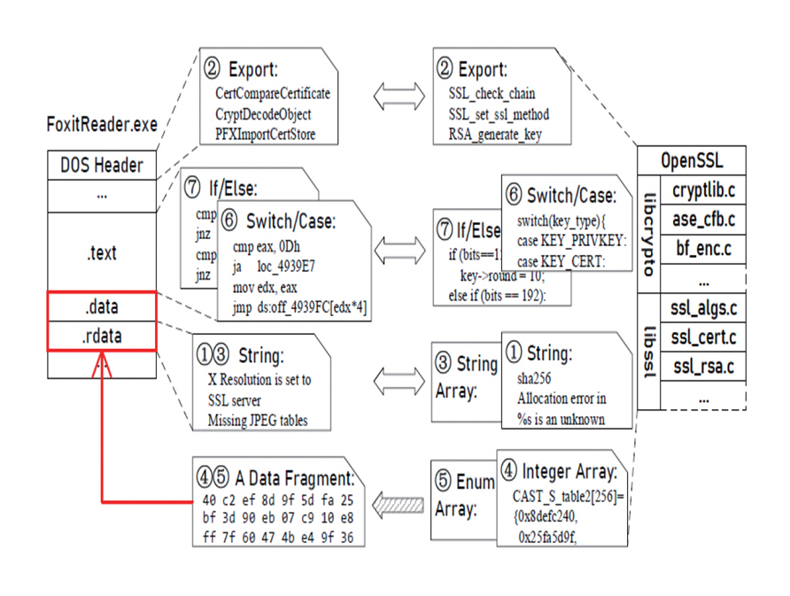 바이너리 코드 내에 컴파일러 최적화나 난독화에도 잘 변하지 않는 문자열(파일 경로, 패키지 이름, 버전 정보 등)을 추출하여 바이너리 코드 유사성을 비교하는 기술이다. 분석 대상 바이너리 파일에서 추출한 문자열과 오픈소스에서 추출한 문자열 데이터베이스를 조회하여 일치하는 패키지를 비교 검색하고, 여러 패키지에 공통으로 존재하는 짧은 문자열에는 낮은 가중치를 부여하고, 고유한 문자열에는 높은 가중치를 부여하여 정확도를 높이는 방식을 채택하고 있다. 대표적으로 B2SFinder[3]는 소스 코드를 이진 코드로 컴파일하는 과정에서 비교적 잘 보존되는 7가지 추적 가능 특징(문자열, 문자열 배열, Export 함수, 정수 배열, 열거형 배열, If/Else 구문, Switch/Case 구문)을 기반으로 대상 바이너리에서 추출하여 이미 구축된 오픈소스 데이터베이스의 정보와 매칭하는 기술을 적용하고 있다. B2SFinder의 7가지 코드 특징 추출하는 과정은 그림 2와 같다.