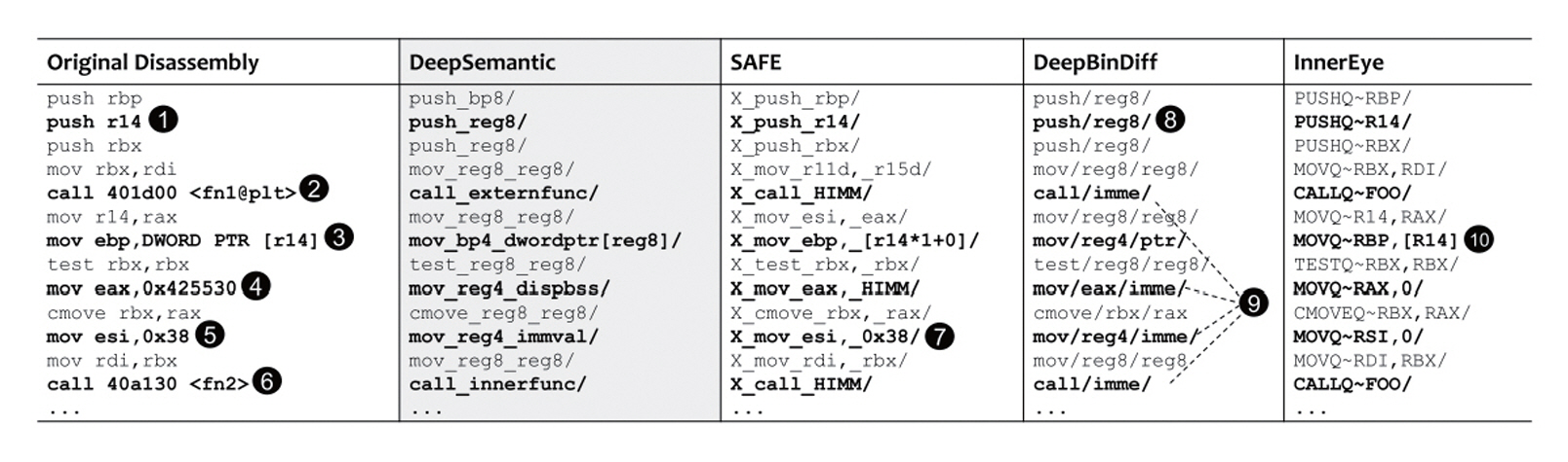 한편, 어셈블리 코드를 그대로 학습할 경우 의미와 무관한 노이즈나 OOV 문제가 발생할 수 있다. 이를 해결하기 위해 각 연구에서는 어셈블리 코드에 대한 고유한 정규화(Normalization) 방식을 정의‧ 적용한다. 정규화 방법은 모델 성능에 큰 영향을 미치며, 더 나은 정규화 전략을 제시한 연구로 Deep-Semantic[13]이 있다. 이 연구는 균형 잡힌 명령어 정규화(Well-Balanced Instruction Normalization)를 목표로 하며 BERT에 적용하여, 코드 의미 보존과 임베딩 품질을 동시에 개선하였다(그림 3).